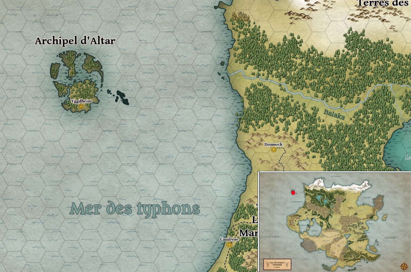 L’archipel d’Altar est un rassemblement d’îles à l’ouest du Continent, au large des Terres Sauvages principalement peuplée par les Altari. Ces rocs d’origine volcanique sont couverts de larges plaines boréales et de forêts de pin, les côtes sont faites de fjords profonds et de falaises où il est difficile d’accoster pour les navires. L'Achipel est régulièrement balayée par les violentes tempêtes de la mer des typhons.