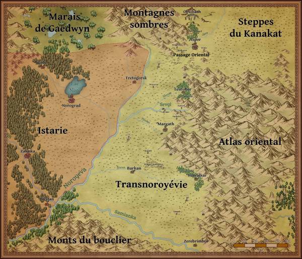 Vos aventures prennent place dans les vastes terres frontalières de Transnoroyévie, au-delà de la frontière orientale du plus puissant empire du monde connu : l’Empire Arkadien. Ce territoire aux portes de la grande steppe appartenait autrefois aux nomades kanaks, peuple de cavaliers vivants aux grès des saisons sur la grande plaine bordée par les montagnes. Mais la découverte des grands gisements aurifères voilà un siècle précipita une suite d’évènements qui bouleversa à jamais l’équilibre de cette région.