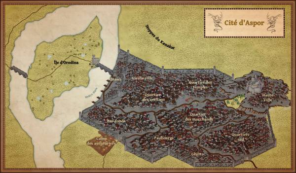 Votre aventure démarre dans la cité d’Aspor, l’une des plus grandes et des plus puissantes des cités joyaux. Située aux portes des steppes, Aspor doit sa richesse à ses mines d’or, exploitées dans les collines environnantes, qui bien qu’en partie épuisées continuent de faire la puissance des marchands de la cité.