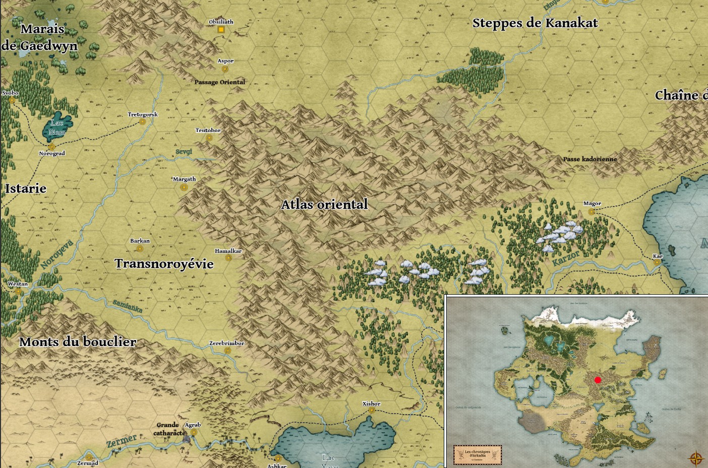 L'infranchissable chaîne montagneuse de l'Atlas Oriental s'étend à l'est du Continent, séparant la transnoroyévie de la lointaine kador par des centaines de kilomètres de hautes montagnes. Nul dans l'histoire connue n'est jamais parvenu à trouver un passage sûre à travers les cols déchiquetés de cette immense massif montagneux, dont le plus haut sommet culminerait à plus de 10.000 mètres de haut.