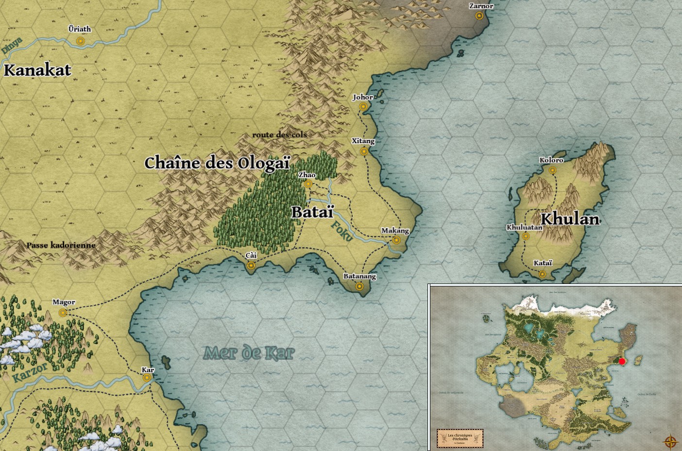 Coincée entre la chaîne des Ologaï et l'océan de l'aube, la terre de Bataï dans l'est lointain a été le berceau de la civilisation du peuple fang. De grandes collines terrassées bordées d'immenses forêts font place à des plaines fertile en aval du fleuve Foku, où se développèrent des ports prospères et des villages productifs.