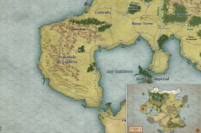 Calderis est une province de l'Empire Arkadien majoritairement peuplée par les Caldères dans les montagnes et les arkadiens dans les villes côtières, c’est une péninsule montagneuse immense mais peu peuplée du fait de son aridité. Seul l’est de la péninsule est plus dense, l’ouest étant trop sec pour pratiquer une quelconque agriculture. Les paysages de Calderis se composent de grandes plaines rocheuses et poussiéreuses, entrecoupées d’îlots de verdure bordant les rivières qui s’écoulent de la montagne. La province vit essentiellement de ses mines dans la montagne et de la production de vin, profitant des coteaux ensoleillés qui bordent les Dômes caldériens. Les vins de Calderis, surtout ceux de Vinomontis, sont réputés pour être les meilleurs de tout l’Empire et s’exportent à grand frais depuis les ports côtiers de Caldéria et Massilia.
