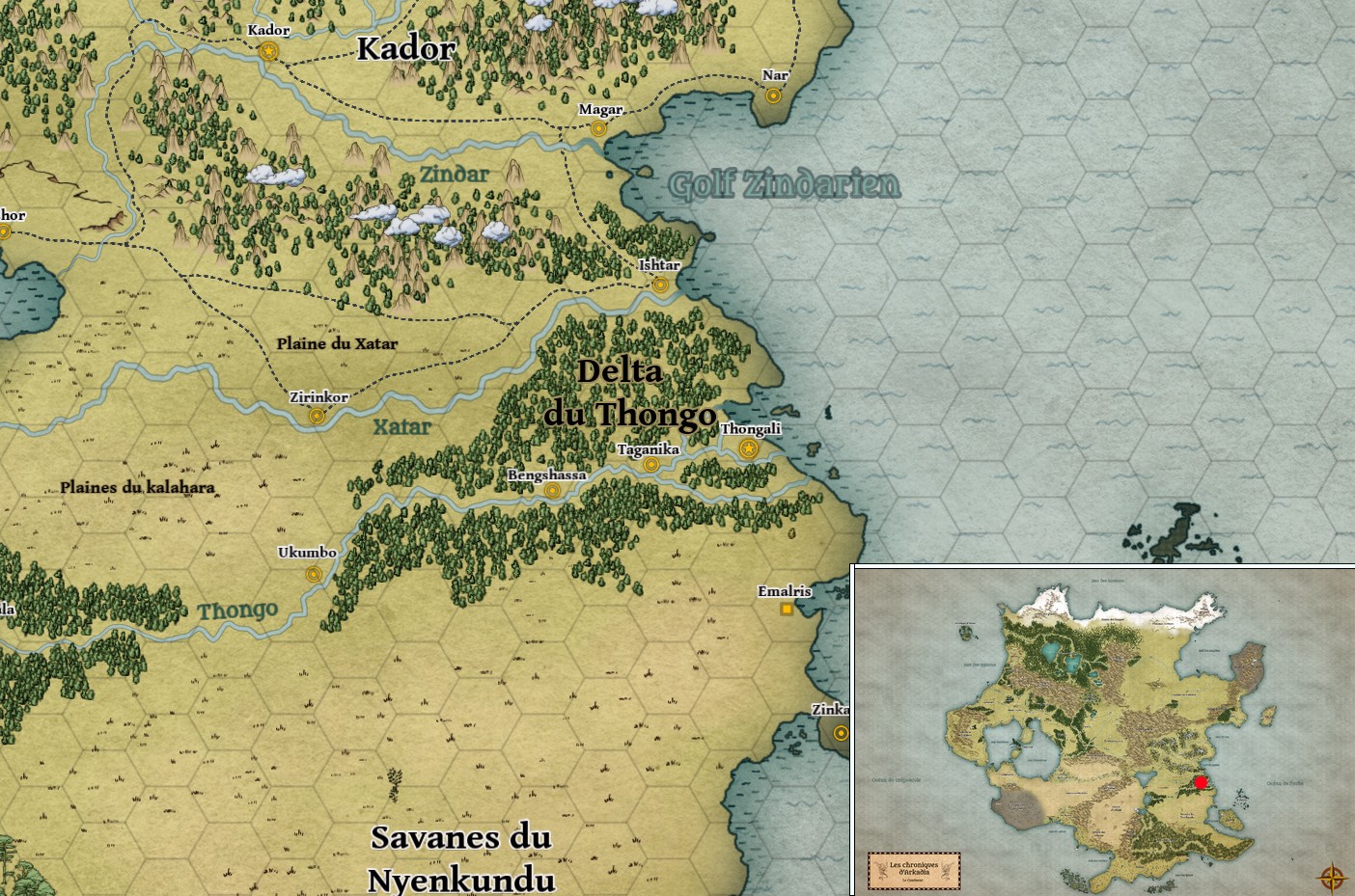 Cette région appartient au petit royaume de Thongaï et est peuplée majoritairement par les thongali, une ethnie nyenkali ayant développé leur civilisation le long du fleuve. Les berges du fleuve sont très civilisées, on y trouve de nombreux villages exploitant ses crus pour faire pousser des céréales, ainsi que des centres urbains prospèrent où se développe une économie basée sur l'artisanat et le commerce fluvial.