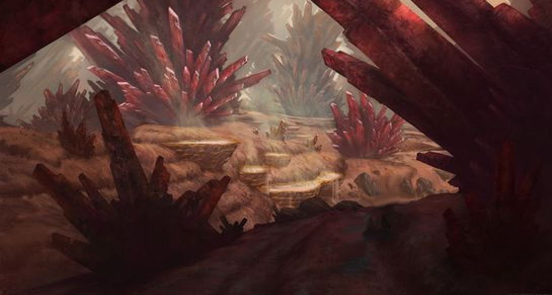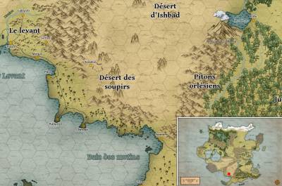 Au sud du grand désert d'Ishbad s'étend le désert des soupirs, lieu maudit et oublié qu'aucun homme sain d'esprit ne s'aventurerait à parcourir. Le désert des soupirs est sombre, il est parcouru par de nombreuses masses rocheuses desquelles jaillissent des cristaux de couleur rougeoyante qui portent des grandes zones ombragées. Ces cristaux de nature inconnue auraient des propriétés magiques, mais rares sont ceux qui oseraient s'y rendre pour s'en procurer tant la réputation du lieu est sinistre. La lisière du désert des soupirs est marquée par des obélisques gravés d'anciens hiéroglyphes et marquant la frontière au delà de laquelle il ne faut pas s'aventurer.