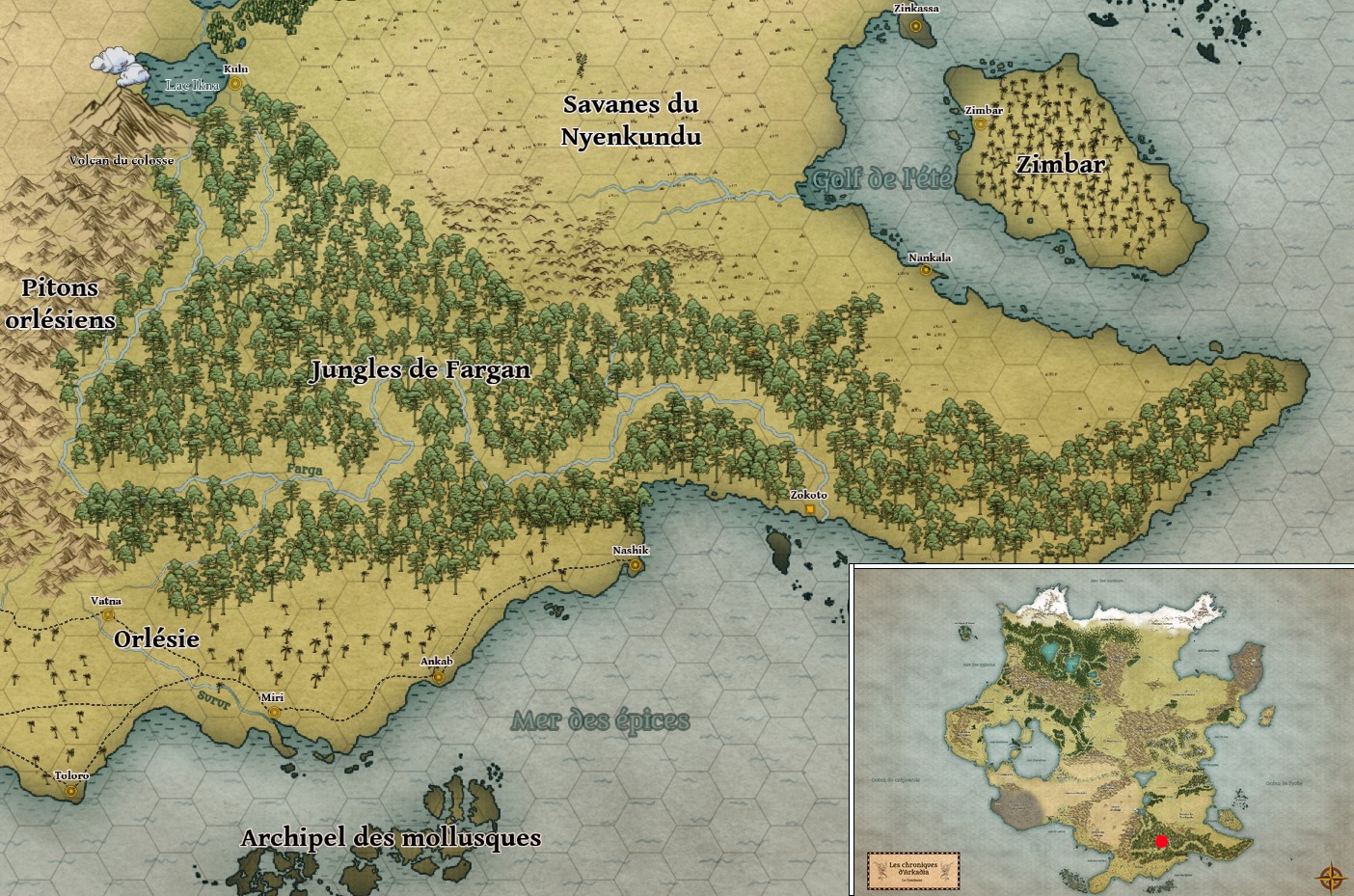 Les jungles de Fargan sont une immense étendue tropicale de jungles inexplorées situées entre les savanes du nyenkundu et l'Orlésie, au cœur de laquelle s'écoule les eaux noires de la rivière Farga qui donna son nom à la région. Elle serait le berceau de la civilisation des elfes fargarans, bien que ceux-ci en ai migré en des temps reculés.