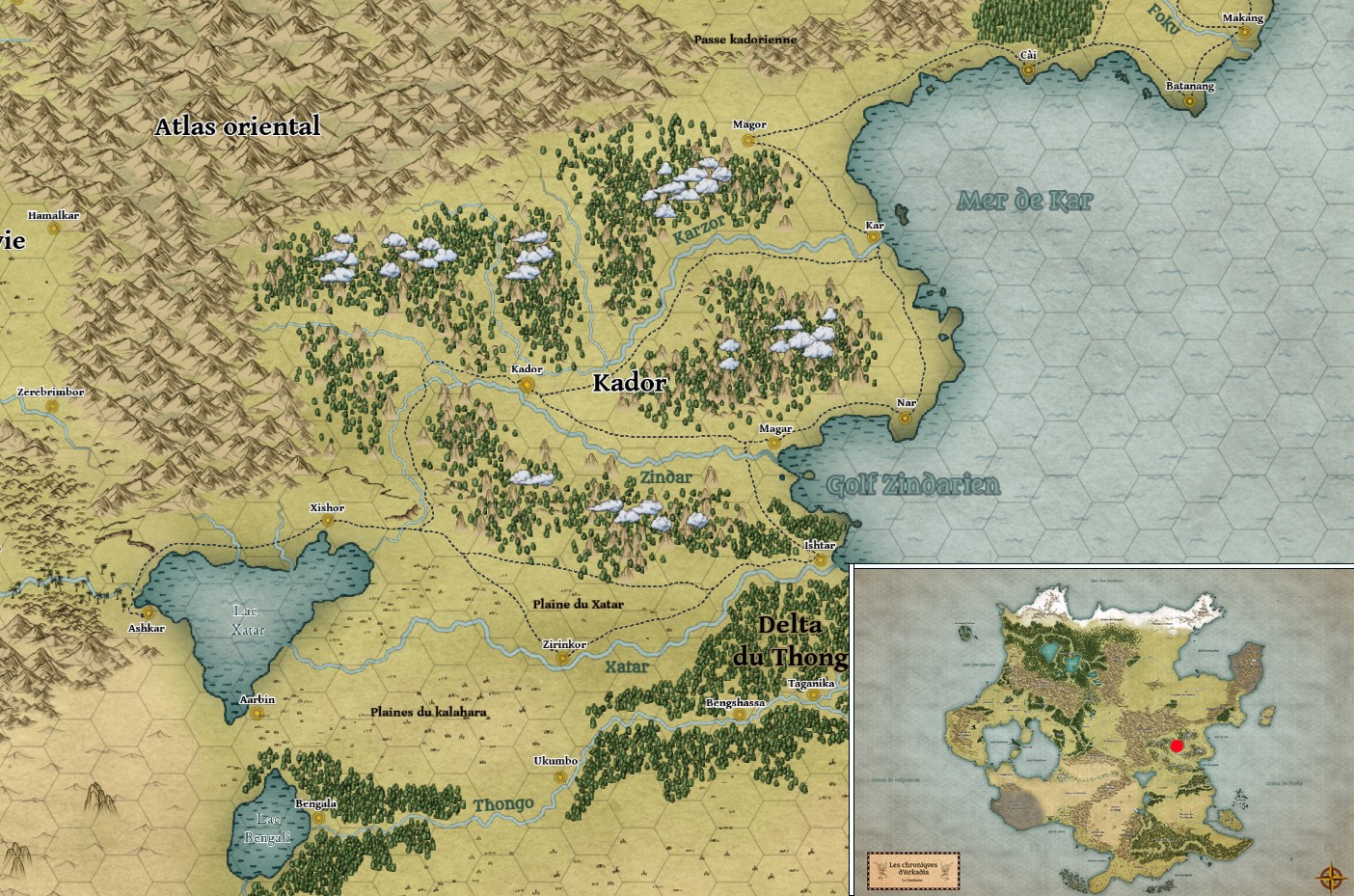 La région de Kador est un territoire à l'extrême est du Continent caractérisé par des régions montagneuses et escarpée qui se termine à l'est par de grandes plaines humides. Parcourue par 3 grands fleuves nourriciers, le Xatar, le Zindar et le Karzor, la région profite d'un climat incroyablement favorable à l'agriculture, les pentes escarpées des collines ont été terrassées pour former de grandes rizières où il est possible de faire plusieurs récoltes par an. Entre les grands fleuves s'étendent des montagnes escarpées recouvertes de forêts humides, les locaux les appellent forêts nuage, car leur sommet sont en permanence recouvert par les brumes.