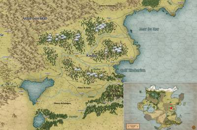 La région est le berceau de la civilisation des kadoriens et de leur Empire, l'Empire Kadorien, les bandes de terres qui s'étendent dans les plaines de l'est et le long des fleuves sont parmis les plus densément peuplées du continent, les fleuves sont parcourus par une armées de bateliers qui remontent les richesses des ports vers le coeur de l'Empire. Au fur et à mesure que l'on s'éloigne des fleuves, la population se fait moins dense, jusqu'à devenir extrêmement éparse dans sur les contrefort de l'Atlas Oriental, région dangereuse uniquement patrouillée par des soldats de l'Empire.