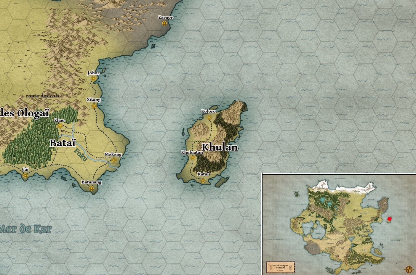 Khulan est une grande île au large des côtes de Bataï à l'est du Continent. Cette île montagneuse est couverte d'une végétation dense, elle est régulièrement battue par les tempêtes de l'océan, y débarquer est difficile pour les navires car elle ne dispose que de quelques plages en haut profonde permettant de s'en approcher. Sa façade Est exposée aux intempéries est peu peuplée, on y trouve surtout de grandes forêts et des montagnes abruptes, l'ouest quant à lui est constitué de quelques plaines où se trouvent les grands ports et l'essentiel de la population.