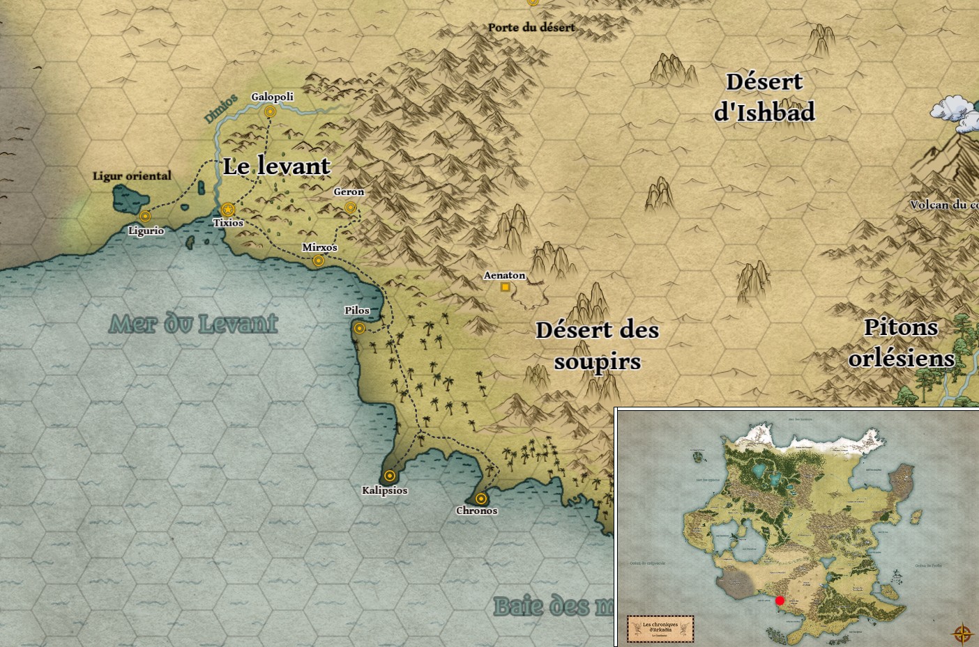 La région est assez civilisée, les campagnes sont parsemées de domaines agricoles où l'on exploite oliveraies et fruits en tous genres. Les cités du levant vivent essentiellement du commerce maritime, profitant de leur flotte importante pour commercer avec les cités orlésiennes, les biens sont ensuite revendus aux marchands mudjaïrah qui font le transit à travers le désert vers les cités du nord.
