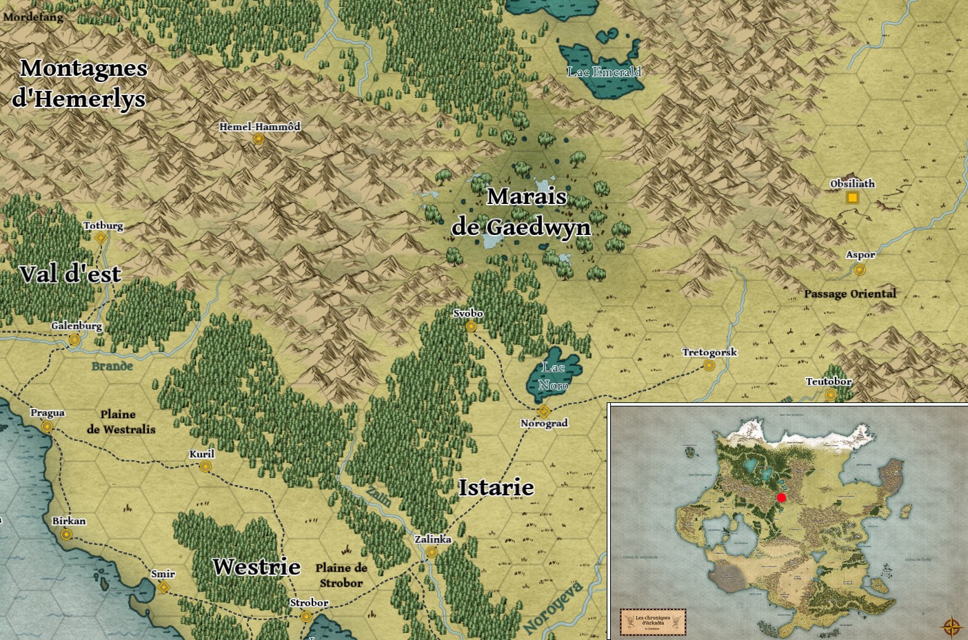 Le marais de Gaedwyn est un territoire sauvage, très peu peuplé hormis par quelques tribus sha-hasin habituées à vivre dans cet enfer infesté de moustiques et de monstres. Il est extrêmement difficile de s'orienter dans le marais et le sol meuble empêche toute grande construction, ainsi la plupart des voyageurs évitent de s'y aventurer et préfèrent la route des montagnes pour atteindre les terres sauvages.