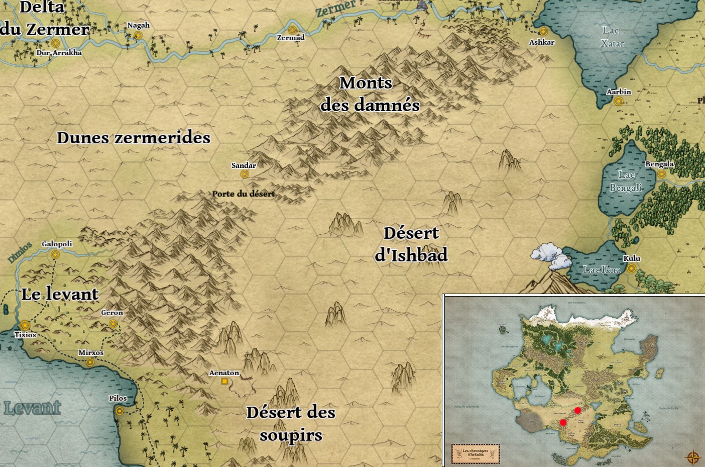 Les monts des damnés sont une chaine montagneuse située entre le désert d’Ishbad et les Dunes zermerides. Ces montagnes arides n’ont pas une si grande altitude, mais sont très difficiles à naviguer du fait des canyons profonds qui les parcourent. Le territoire est pratiquement inhabité, seules les falaises aux abords sont peuplées par les krills, mais ils ne s’aventurent jamais au cœur des canyons. On trouve dans ces canyons des ruines d’une ancienne civilisation, leurs cités troglodytes creusées à même les falaises abritent de nombreuses nécropoles. L’histoire des vestiges de ces cités de l’âge du mythe s'est perdue avec le temps.