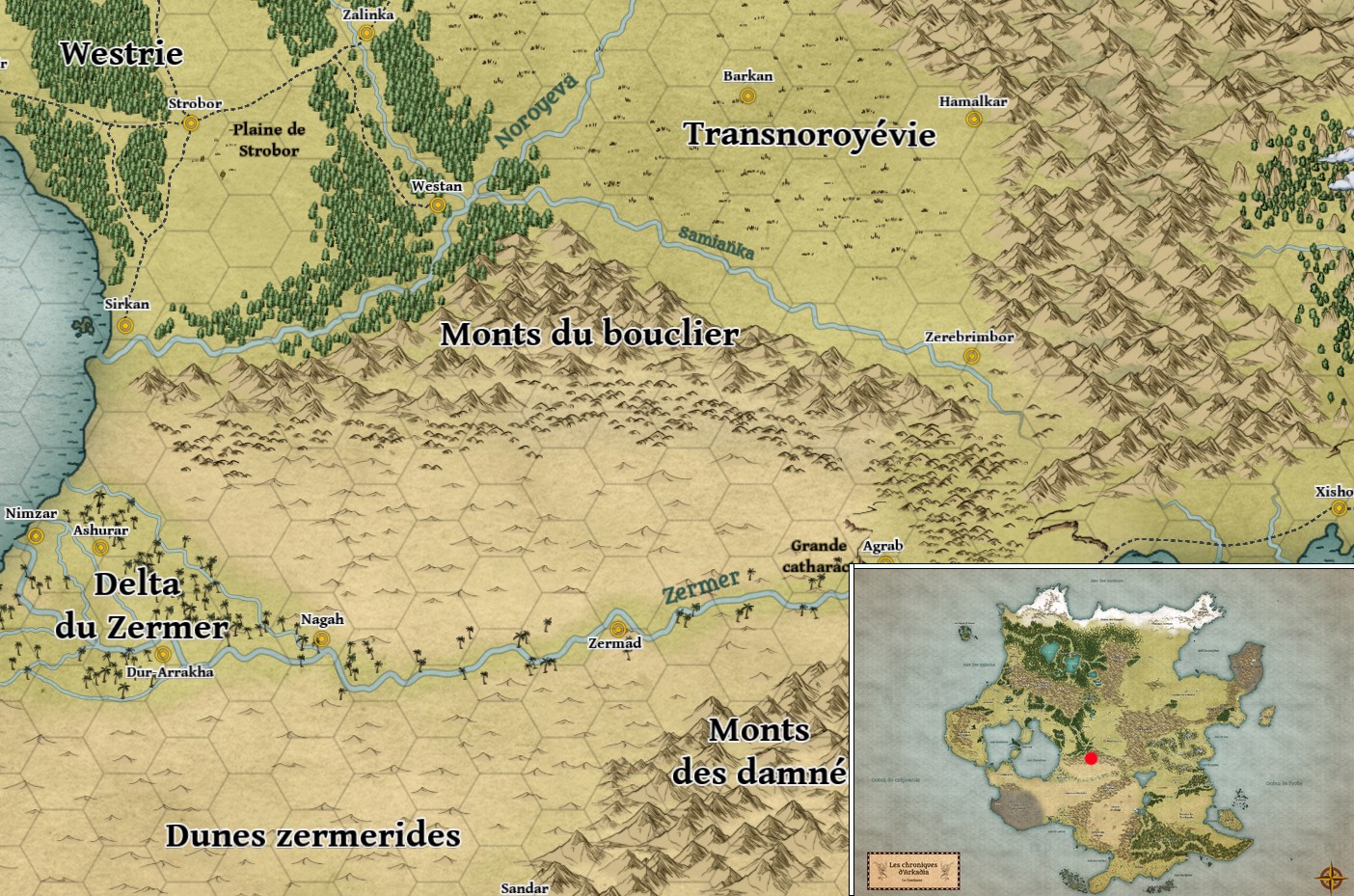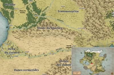 Les monts du bouclier sont une chaine montagneuse de haute altitude séparant le grand désert des dunes Zermerides de la Transnoroyévie. On nomme ainsi ces montagnes car elles protègent le nord de l'extension perpétuelle du désert. La face nord est plus verte que la face sud qui elle est plutôt aride. Ces montagnes sont d'ordinaire évitée par les voyageurs qui préfèrent prendre le passage de l'est, cela est dû à plusieurs facteurs, notamment le fait qu'il est très difficile de les traverser, leurs flancs abrupts forçant presque toujours à l’escalade.