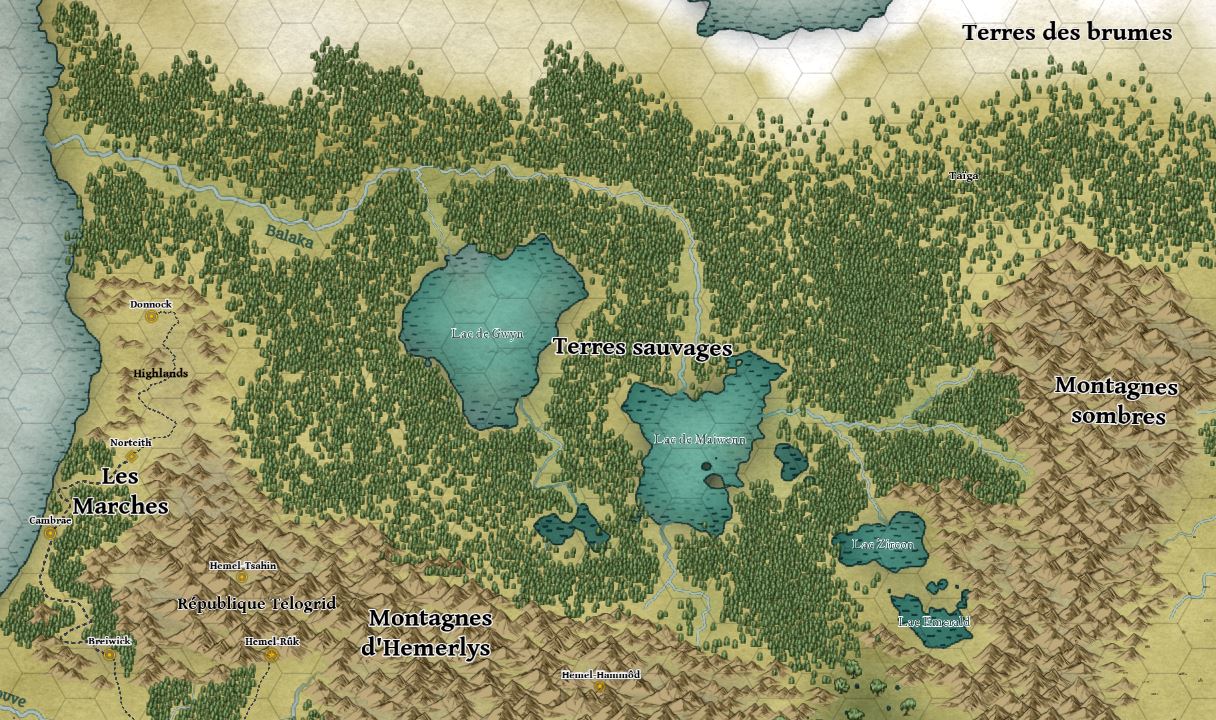 Les Terres sauvages sont un territoire immense s’étendant au nord de Montagnes d’Hemelrys, composés de grands lacs, de forêts primaires extrêmement denses et de vallées profondes. Ce vaste territoire est resté extrêmement sauvage, il ne dispose de presque aucune infrastructure hormis des sentiers forestiers régulièrement pratiqués par les habitants de la région.