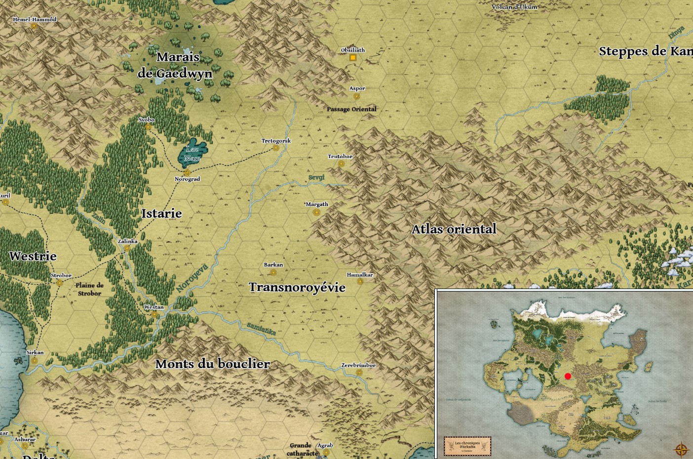 La Transnoroyévie est un large plateau d'altitude sauvage aux portes de la grande steppes du Kanakat et séparé de l’Empire Arkadien par la Noroyeva. Elle est bordée à l’est et au sud par la chaîne de l’Atlas Oriental et par les Monts du bouclier.