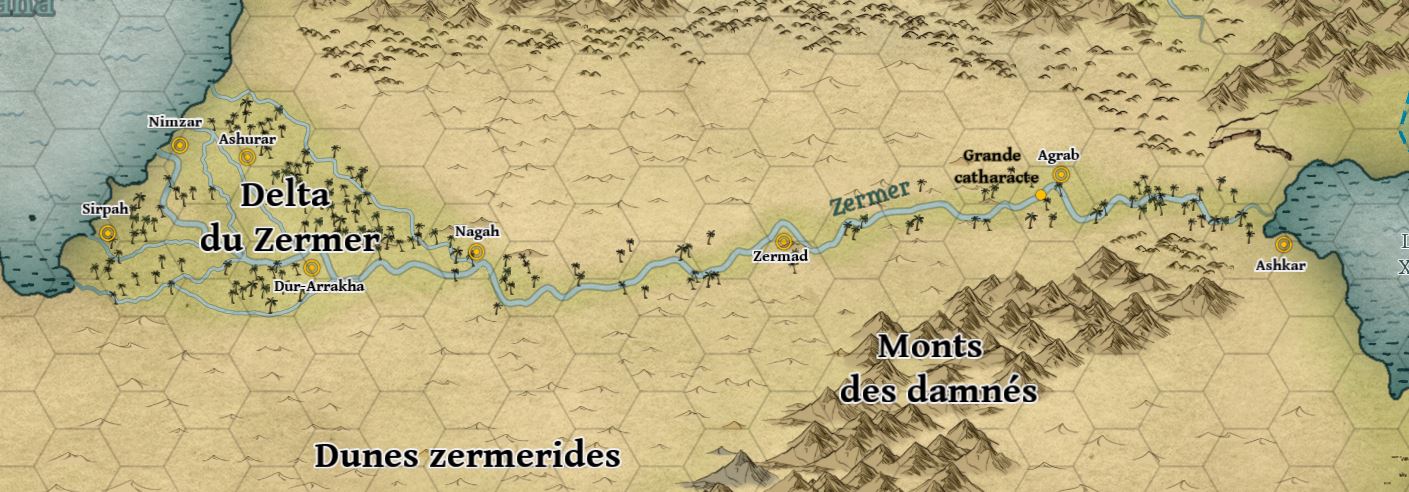 Le Zermer est l'un des plus grand fleuve du monde, il prend source dans le lac Xatar, à la frontière de Kador et traverse ensuite le désert des dunes zermerides avant de se diviser en un delta se jetant dans la mer d'Istariana. Ce fleuve nourricier permet grâce à ses crus importantes de laisser des sols limoneux parfaits pour l'agriculture.